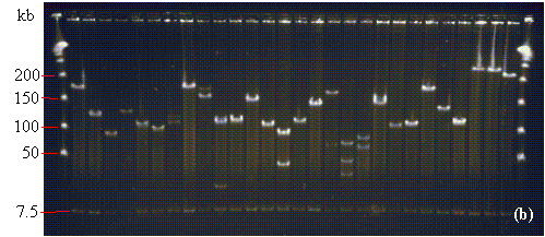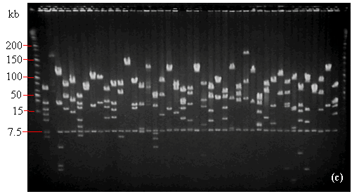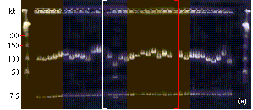 - NotI digests of minipreps from randomly-selected white colonies of (a) Gossypium raimondii, (b) soybean (Glycine max 'A3244'), and (c) maize (Zea mays 'B73') libraries. In (a) and (b) the PFGE lambda ladder is visible at the far-right and far-left sides of the photograph. In (c), the PFGE Midrange I ladder is in the first and last lanes. In each photo, note the row of vector bands at 7.5 kb. For the dicots G. raimondii (a) and soybean (b), most lanes contain only one or two non-vector bands indicating relatively few genomic NotI sites. As shown in (c), NotI restriction sites are considerably more common in monocot DNA. In (a), one of the lanes contains no visible DNA suggesting that the miniprep was lost (white rectangle), and one "false positive" (red rectangle) is visible. No false positives or empty lanes are seen in (b) and (c). The average insert sizes for the G. raimondii, soybean, and maize libraries are 120, 140, and 140 kb respectively (see TABLE 1.1).