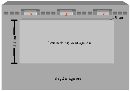 (a) Using a scalpel, join adjacent comb-made wells to form three slot-wells. Place a thin layer of LMP agarose in the bottom of each slot- well and allow the agarose to solidify. Insert blocks x, y, and z into the slot-wells. Place the PFGE lambda ladder into wells flanking the slot-wells as shown. Be sure to push x, y, and z to the leading edge of their respective slot-wells. Seal all wells with LMP agarose. Using a ruler as a guide, use a scalpel to cut out a large block of agarose from the center of the gel (see diagram). Fill the resulting space with 1% LMP agarose, and allow the LMP agarose to solidify. Run the gel using the following parameters: run time = 18 hr, initial switch time = 3 sec, final switch time = 5 sec, included angle = 120°, volts/cm = 6.0, buffer temperature = 12°C. |