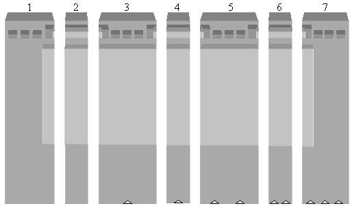 (b) Cutting the gel. After electrophoresis, divide the gel into seven pieces as shown above. The pieces are referred to as 1-7 from left to right. Cut notches into the bottom of pieces 3-7 as shown. Notches facilitate rapid reconstruction of the gel. Stain the odd-numbered pieces with ethidium bromide. Do not stain the even-numbered pieces as these contain genomic DNA which may be used in subsequent ligation reactions. |