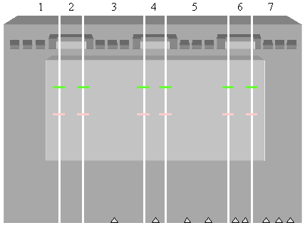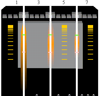 (d) Reconstruct the gel by placing the unstained even-numbered pieces between the stained odd-numbered pieces. Use the notches at the bottom of pieces 3-7 to facilitate proper assembly of the gel. Extend the incisions at 125 kb and 350 kb on each odd-numbered gel piece into adjacent even-numbered gel pieces (green and pink lines). Note: The center gel piece should never be exposed to UV light from the light box as this can break the DNA! |