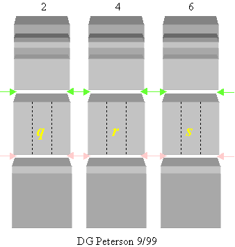 (e) Using a scalpel or razor blade, connect the appropriate incisions on each even-numbered gel piece as shown. The resulting center blocks containing DNA between 125 and 350 kb are referred to as q, r, and s, respectively. Subsequently, cut each of the three center blocks longitudinally to produce three blocks of roughly equal size (dotted lines). Place the three q blocks in one centrifuge tube, the three r blocks in a second tube, and the three s blocks in a third tube. The DNA in these blocks may be suitable for ligation. |