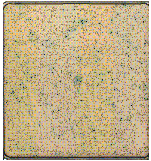 - Image of an X/I/C tray containing Gossypium raimondii BAC clones. The image was obtained by scanning the plate using a desktop scanner. Consequently, there is some color distortion (in particular, white colonies appear brown). The tray contains approximately 3500 clones. About 7% of the clones are blue. The size of the image has been reduced so that it can fit on a single page.