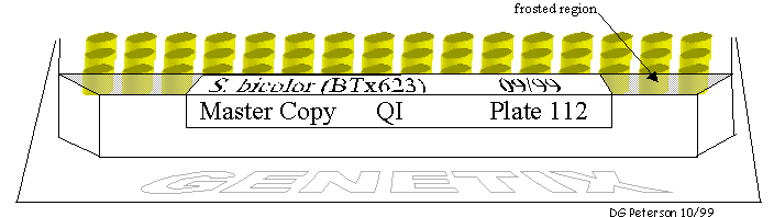 - Labeling microtiter plates. Each plate should be labeled with information regarding its contents and origin. Traditionally each label is placed on the "frosted" end of the plate. Labels should be uniform in format. In the example above, the species (S. bicolor = Sorghum bicolor), the cultivar/genotype (BTx623), and the date that the library was made (09/99 = September 1999) are listed on the horizontal surface of the label. Copy information (Master Copy), a "quality" designation (QI), and the plate number (Plate 112) are given on the vertical surface of the label. The "quality" (Q) of the copy is based upon how far removed it is from the master copy. For example, the master copy itself has the highest quality and is given the designation QI. A library generated using the master copy as a template would be labeled QII (usually Copy 1 and Copy 2 of the library are directly made from the master copy). A copy made from a QII library would be labeled QIII, etc.