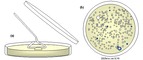 - Spreading test plates. (a) 50 µl of transformation culture is placed in the center of an X/I/C plate. A sterile plating rod is used to distribute the transformation reaction evenly across the surface of the plate. (b) Test plates are incubated for 15-24 hours at 37°C. Bacteria without a plasmid lack the resistance gene to chloramphenicol (CM) and thus cannot grow on the X/I/C agar. Blue colonies contain a plasmid, however they are producing ß-galactosidase (evident by their ability to convert X-GAL into a blue precipitate) indicating that they do not contain inserts. White colonies represent bacteria that contain a plasmid with an insert (hopefully a large piece of genomic DNA) at the multiple cloning site in the ß-galactosidase gene (thus disrupting the gene's activity).