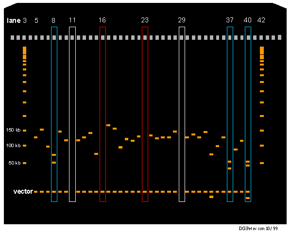 - Diagram of BACs digested with NotI. Lanes 3 and 42 contain the PFGE lambda ladder. All of the sample lanes possess vector DNA except those demarcated by white rectangles. The absence of DNA in these lanes indicates that the BAC DNA was lost during the miniprep protocol. Though most lanes contain one "non-vector" band, some lanes contain several non-vector bands (lanes marked with light blue rectangles). The presence of multiple bands indicates that the insert in question contains one or more NotI restriction sites. The insert size for a particular clone is the sum of the base pair lengths of its non-vector bands. For example, in lane 5, the sole insert fragment has a mean length of approximately 130 kb. In lane 8, the insert size is (50 kb + 70 kb =) 120 kb. If the transformation procedure was successful, there should be few (if any) "false positives" (white clones containing a vector but not a piece of exogenous insert DNA. In the figure, examples of false positives are enclosed in red rectangles. Each false positive has a vector band but no insert band(s).In general, average insert length is best determined using an image capture system with software capable of determining DNA lengths based on a comparison of sample bands to those of a ladder.
