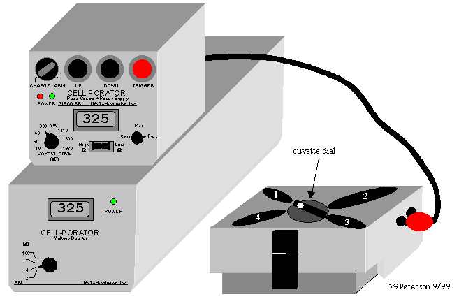 - Electroporation. The lid to the chamber safe is closed and locked, and the power-out plug is inserted into the appropriate holes in the lid of the chamber safe. The cuvette dial on the lid of the chamber safe is turned to "1". A voltage is generated in the power unit. Once a desired voltage is obtained, the "TRIGGER" button is pushed, and the voltage is released into the wires of the power cord, through the power-out plug, into the pins in the lid of cuvette "1", and through the opposed metal liners along the sides of the cuvette. The voltage is eliminated by the passage of current through the path of least resistance (in this case, the transformation mixture). The current applied to the competent bacteria temporarily permeablilizes their cell membranes allowing BACs to enter the cells.