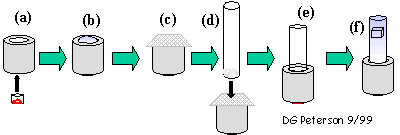 - Assembly and loading of an electro-elution cuvette. (a) Insert a collection cup into the small aperture of an assembly joint. (b) Add 1X TAE to the cup/joint unit until a reverse meniscus is visible at the top of the joint. (c) Place a Miracloth square onto the reverse meniscus. (d) Insert the frosted end of a glass tube into the large aperture of the assembly joint. Push the tube in as far as it will go. The Miracloth should be stretched across the bottom of the glass tube. (e) The cuvette is now completely assembled and ready for loading. (f) Fill the cuvette with sterile 1X TAE buffer. Drop an agarose cube containing size-selected DNA into the cuvette. The cube should drift through the buffer until it rests on the Miracloth stretched across the bottom of the glass tube. Use a glass rod to gently push the cube to the bottom of the tube if it does not drift down by itself.