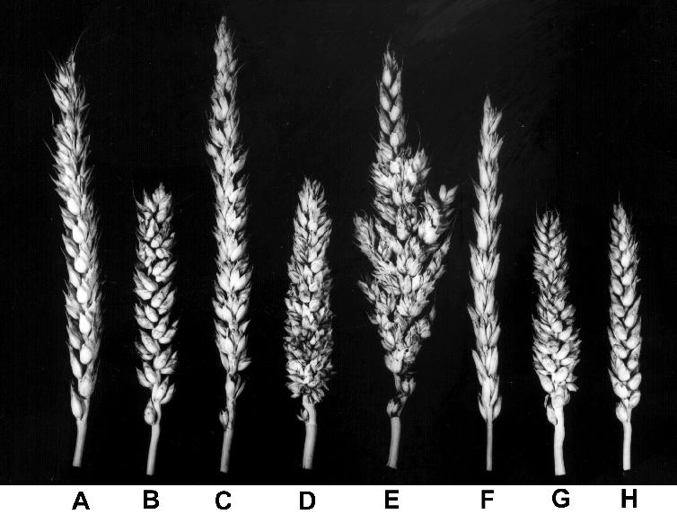 MATERIAL:A collection of wheat gene resources exhibiting different morphological structure of the spike which is maintained at the Agricultural Research Institute Kromeriz, Ltd. (ARI) was used in the presented study. The greatest part of original genetic materials was provided by the research institutes in Zagreb (2) and Novi Sad (3) (Yugoslavia), VIR in Sankt Petersburg (Russia), and CIMMYT (Mexico). These materials were mostly derived from wide crosses of T. aestivum L. with tetraploid species. At the ARI Kromeriz, this material was crossed with selected Czech and foreign cultivars. Based on the spike morphology the developed lines (F7-F12 generations) were classified into the groups as follows (Fig. 1):