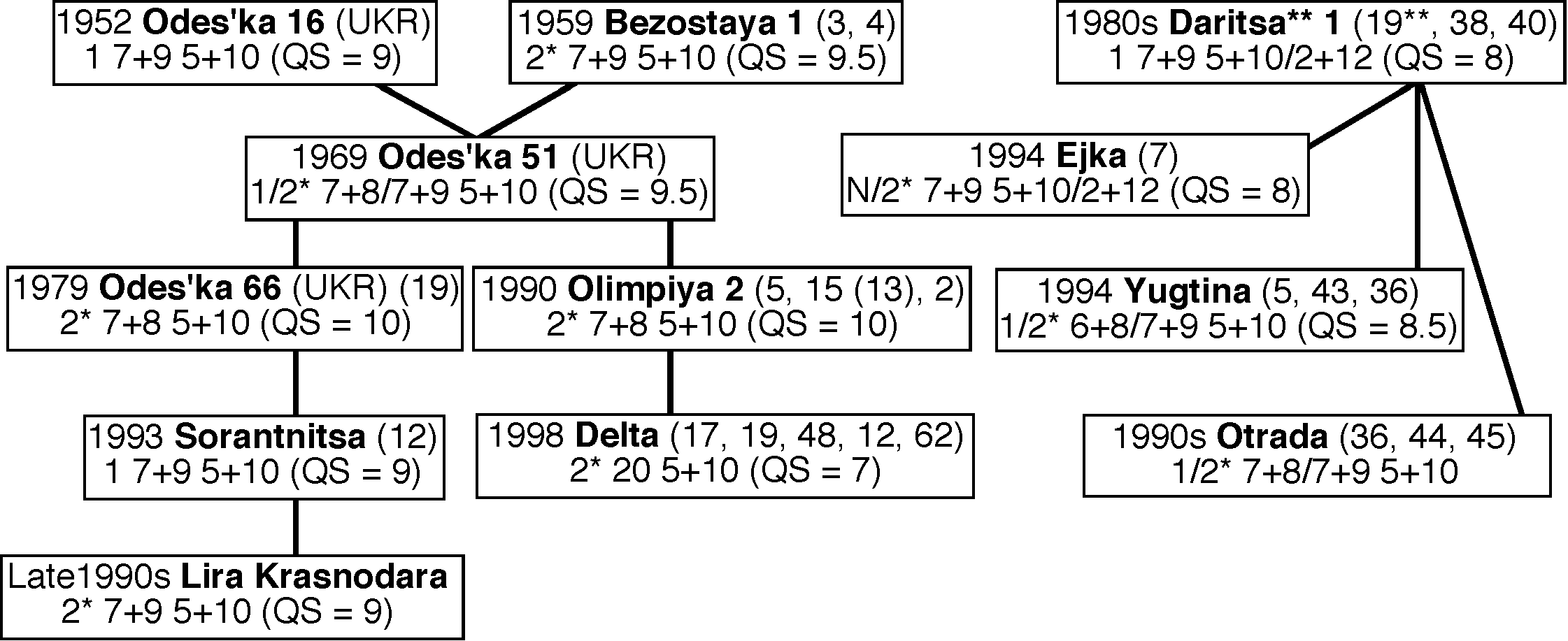 7+9 5+10, QS = 9; 54. T. migushovae; 55. 'INIA 66 (3 (2), 23-25,