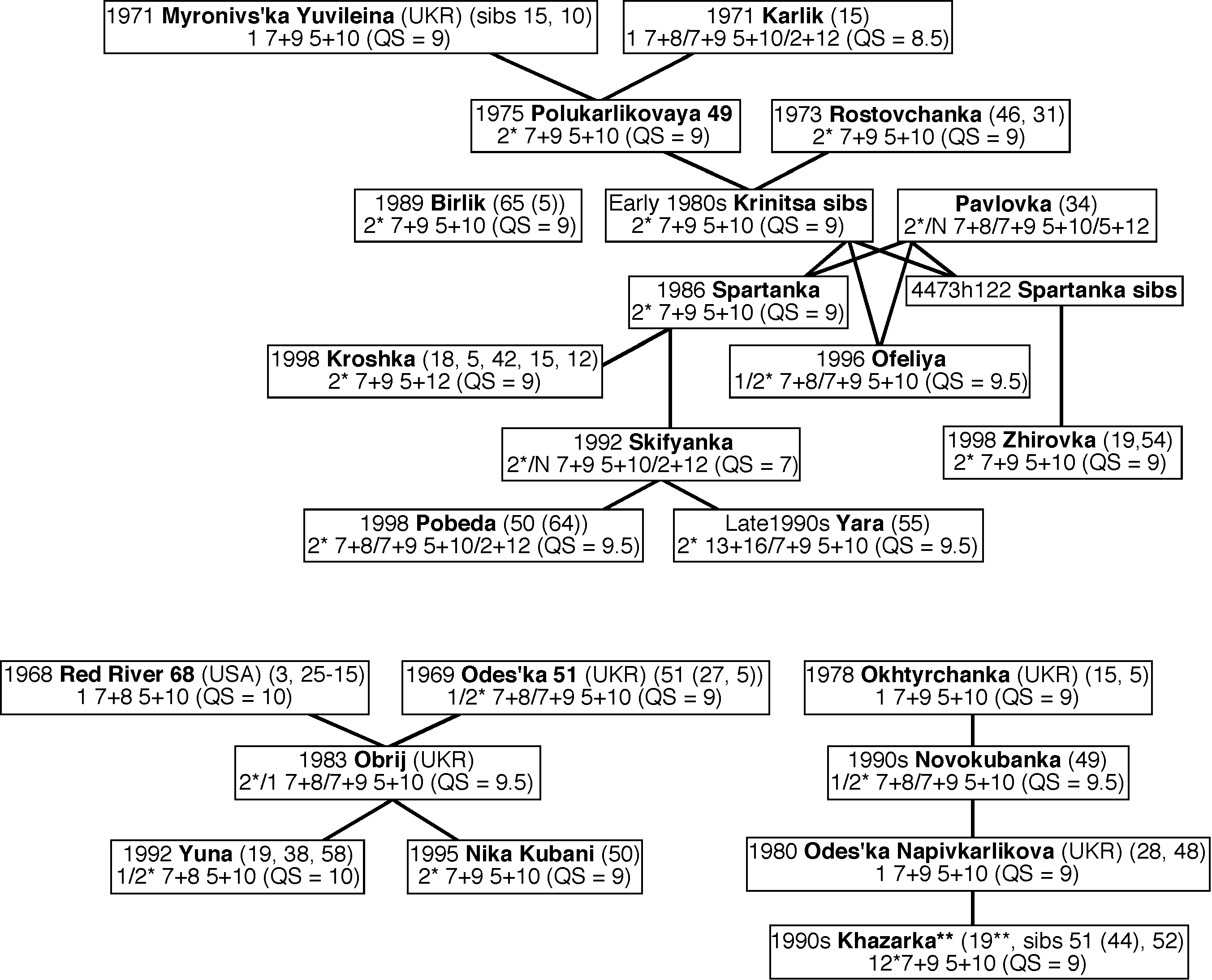Fig. 3. Semidwarf cultivars for fallow and irrigation - derivatives of Ukrainian cultivars. ** denotes cultivars with T1BL·1RS wheat-rye translocation (Rabinovich 1988; Timopheev et al. 1999). For information on the names used in the pedigrees of cultivars (numbers 1-65) and their HMW-glutenin subunits, see the footnote for Fig. 1.