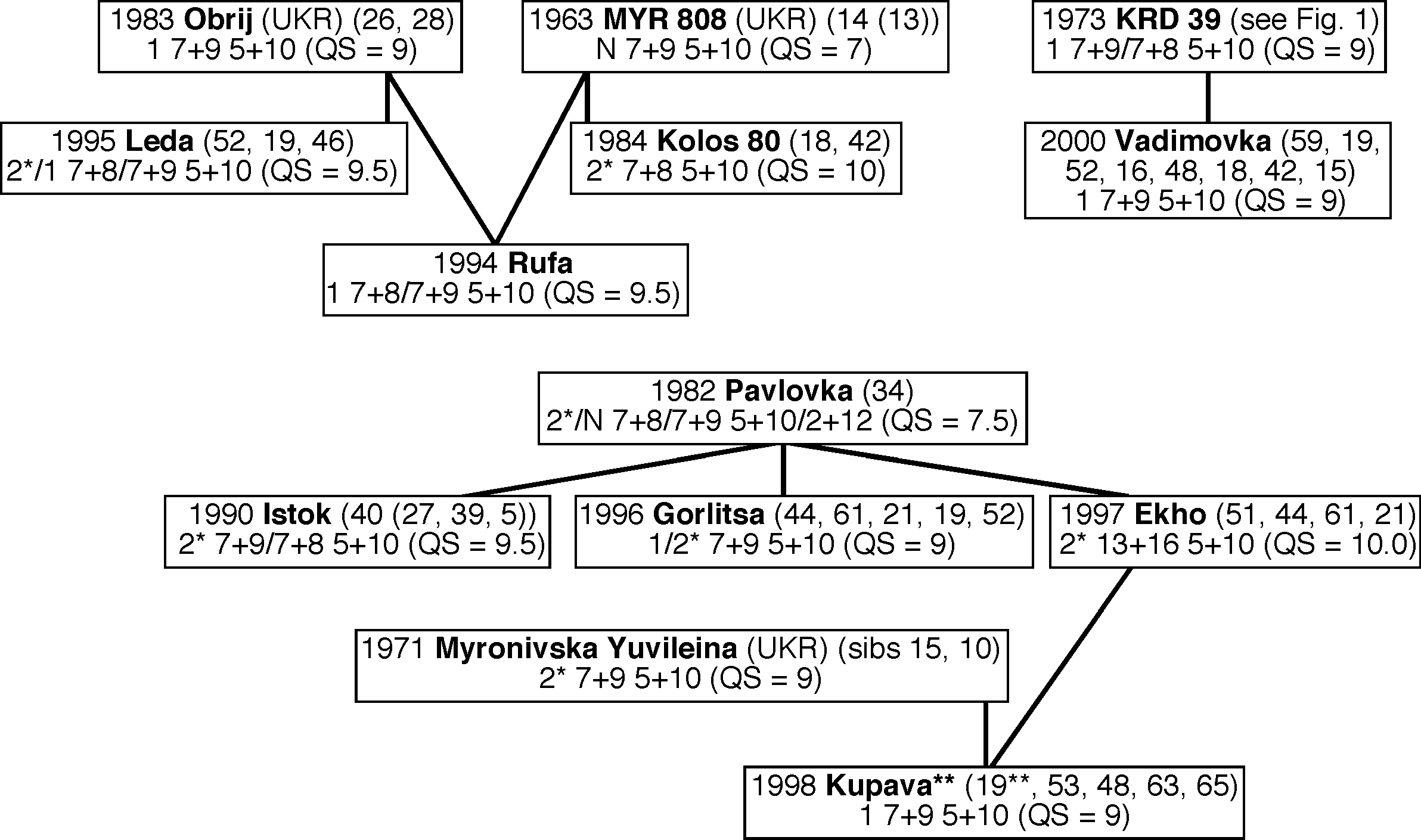Fig. 4. Semidwarf cultivars for foothill and mountain regions - derivatives of Ukrainian cultivars. ** denotes cultivars with T1BL·1RS wheat-rye translocation (Rabinovich 1988). For information on the names used in the pedigrees of cultivars (numbers 1-65) and their HMW-glutenin subunits, see the footnote for Fig. 1.