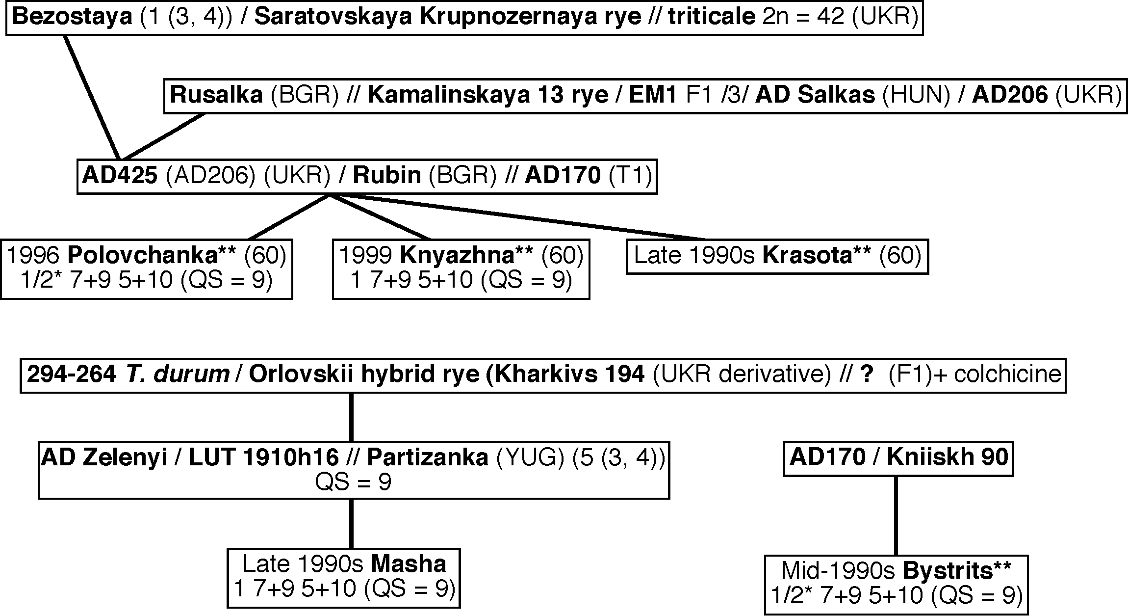 Fig. 5. Winter wheats - derivatives of Ukrainian winter triticale (AD, 2n=42) and rye (R, 2n=14). ** denotes cultivars with T1BL·1RS wheat-rye translocation (Timopheev 1996). For information on the names used in the pedigrees of cultivars (numbers 3-5 and 60) and their HMW-glutenin subunits, see the footnote for Fig. 1.