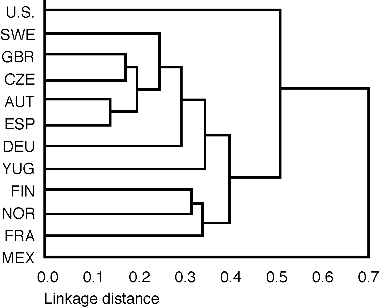 Fig. 7. Clustering analysis of the frequency of HMW-glutenin subunits in wheats from the U.S., Sweden (SWE), Great Britain (GBR), the Czech Republic (CZE), Austria (AUT), Spain (ESP), Germany (DEU), Yugoslavia (YUG), Finland (FIN), Norway (NOR), France (FRA), and Mexico (MEX).