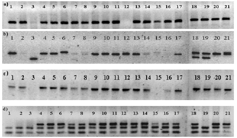 Fig. 1. Amplification pattern of selected STMS markers a) GWM666 on 1AL, b) GWM136 on 1AS, c) GWM582 on 1BS, and d) GWM261 on 2DS. The STMS markers were used for characterization of resistant derivatives of the cross 'CS (PhI)/T. durum cv. WH890-Ae. umbellulata Acc. 3732 amphiploid'. Lanes 1 - T. durum WH890, 2 - T. durum WH890-Ae. umbellulata amphiploid, 3 - Ae. umbellulata, 4 - CS(PhI), 5 - CS, 6 - WL711, and 7 - 21 - resistant derivatives.