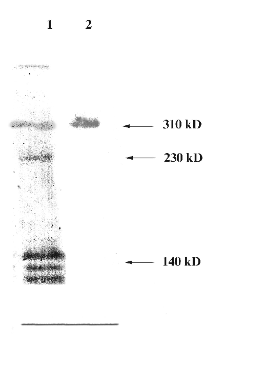 Western-blotting with antibodies to CSP 310 of winter wheat cytoplasmatic proteins in control plants (1) and after cold stress (2).