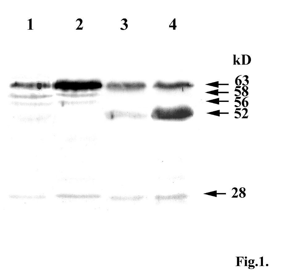 Fig. 13. Mitochondrial dehydrin-like proteins from the control (1), freezing (2), and drought stressed(3) , and ABA treated (4) winter wheat seedlings. Mitochondrial proteins were fractionated by 10 % SDS-PAGE (25 mg of protein per lane), electroblotted onto nitrocellulose membrane, and probed with antibody against dehydrin. Molecular masses of dlps are indicated.