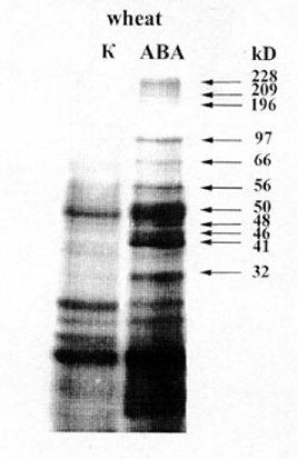 Fig. 17. Heat-stable, ABA-inducible proteins from control (K) and ABA-treated (ABA) seedlings of wheat. Molecular weights of wheat proteins are indicated on the right. Electrophoresis was in 13 % SDS-PAGE.