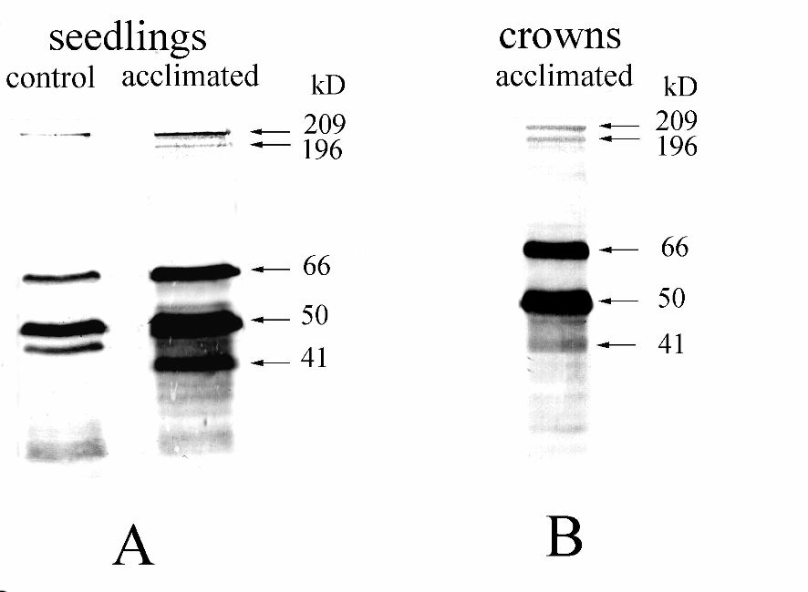 Fig. 26. Dehydrin-like protein of winter wheat seedlings and crowns. Heat-stable proteins were extracted from control and cold acclimated in the laboratory seedlings (a) and crowns of wheat sown on 25 August, acclimated in the field, and sampled on 2 April (b). Extraction and electrophoresis were as described in the legend to Fig. 24. Proteins were transferred to membrane and probed using anti-dehydrin antibodies. Molecular weights of the dehydrin-like proteins are indicated on the right.