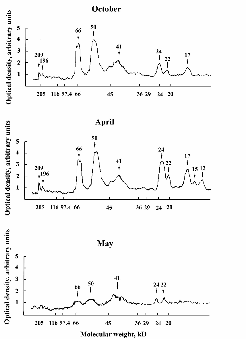 Fig. 28. Heat-stable dehydrins extracted from crowns of winter wheat plants. The dynamics of accumulation/disappearance of RABs with molecular weights 209, 196, 66, 50, 41, and 24 kDa was similar to dehydrins with analogous molecular weights. Seed was sown on 25 August and sampled on 30 October (A), 16 April (B), and 4 May (C). Electrophoresis and Western blotting were as described in the legend to Fig. 27. Molecular weights of proteins are indicated above density tracings.