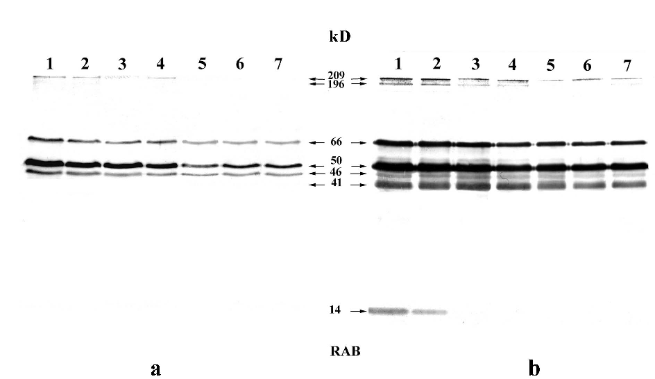 Fig. 30. (b) seedlings of wheat. Electrophoresis was in 10 % SDS-PAGE. Proteins were transferred to membrane and probed using anti-RABs antibodies. The figure illustrates a representative immunochemical membrane. Molecular weights of the proteins are indicated in the center. Lanes 1-3 = winter wheat cultivars Zalarinka, Irkutskaia ozimaia, and Bezostaya-1; and lanes 4-7 = spring wheat cultivars Angara-86, Tyumenskaia-80, Rollo, and Drott.