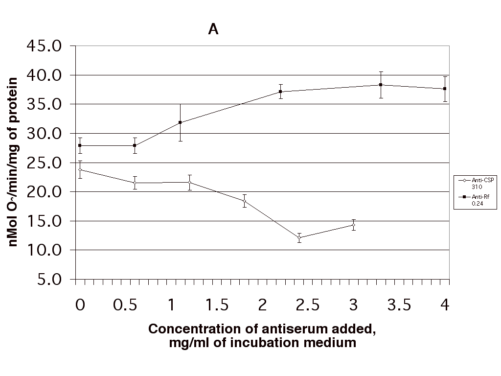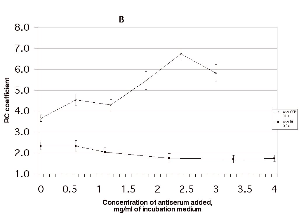 Fig. 7. The influence of antisera against CSP 310 and the antigen with Rf 0.24 on the rate of state 4 respiration (A) and respiratory control coefficient (B) in winter wheat mitochondria. M ± SE, n = 6.