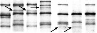 | Fig. 1. A = 0 / 13+16 / 2+12; B = 2* / 7+8 / 5+10; and C = 2* / 7 / 2+12; D = 1 / 7+9 / 5+10. Glu-Ay bands are marked by arrows. | Fig. 2. The band (arrows) belonging to Glu-B1 7+9 can be seen in lanes A (0 / 7+9 / 5+10) and B (7+9 alone from a genotype lacking the Glu-D1 bands); lane C shows a genotype with 0 / 7+8 / 5+10, clearly lacking the lower Glu-B1 z-band | |||||