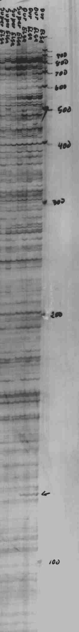 Fig. 2. AFLP analysis comparing SuperElsa (leftmost four lanes) with AC Elsa (labeled 'Our Elsa' in next four tracks to the right). Note the similarity of banding patterns between SuperElsa and AC Elsa with the exception of the band highlighted by the arrow (between the 100- and 200-bp ladder bands), which is present in AC Elsa and absent in SuperElsa.