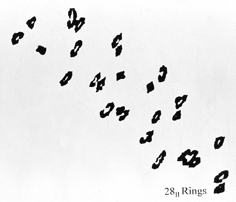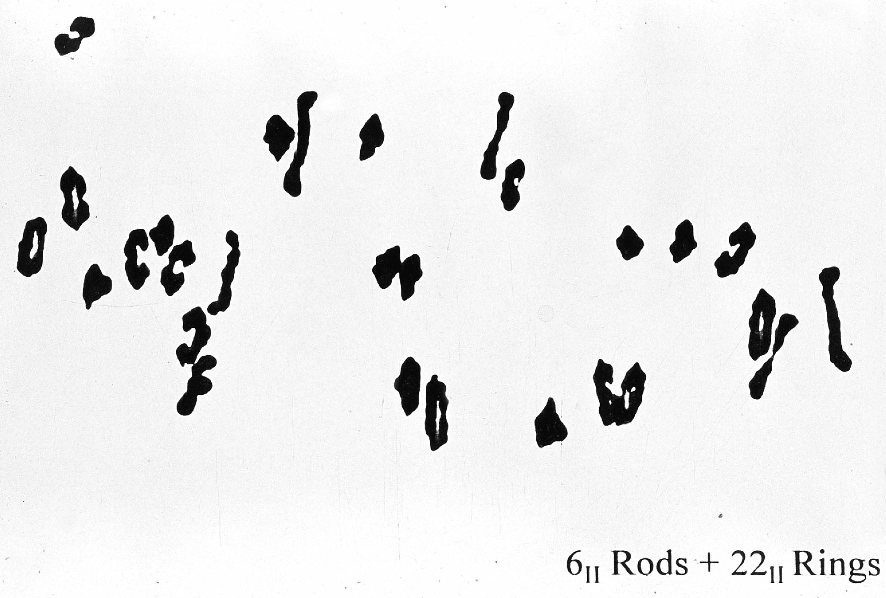 Fig. 3. The partial bread wheat/Aegilops geniculata amphiploid showing (a) 2n = 8x = 56 chromosomes in a mitotic cell, (b) a meiocyte with 28 ring bivalents, and (c) a meiocyte with 6 rod bivalents + 22 ring bivalents.