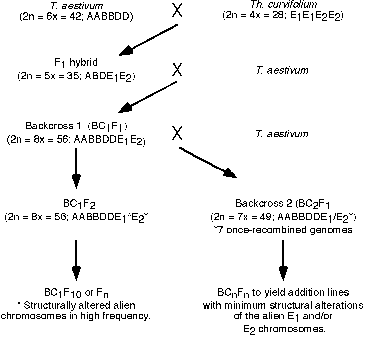 Fig. 4. Scheme for addition line production that reflects variations in chromosome composition due to recombination events in the two related genomes during the selfing maintenance of backcross progenies.