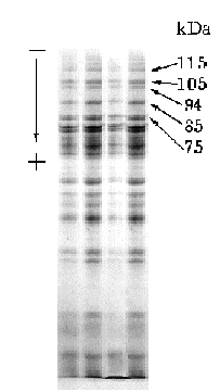Fig. 16. SDS-PAGE electrophoresis of soluble proteins of wheat cultivars (1) Scala, (2) Tulunskaia 12, (3) Rollo, and (4) Drott.