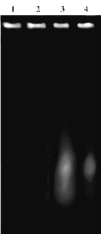 Fig. 2. Electrophoresis of nucleic acid preparations extracted from maize, Elymus, winter rye, and winter wheat CSP 310-like proteins obtained by affinity chromatography; lane 1, from maize; lane 2, from Elymus; lane 3, from winter rye; and lane 4, from winter wheat.