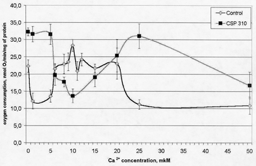 Fig. 6. The influence of Ca^+2^ concentration on CSP 310-dependent changes of state-4 respiration in winter wheat mitochondria (mean ± standard deviation, n = 6.