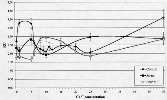 Fig. 8. The influence of Ca^+2^ concentration on low-temperature stress and CSP 310-dependent changes of respiratory control coefficient in winter wheat mitochondria (mean ± standard deviation, n = 6).