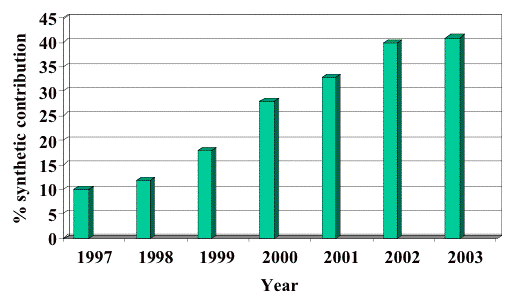 Fig. 1. Contribution of synthetic wheats to the pedigrees of germ plasm comprising CIMMYTs bread wheat-breeding program for marginal areas.