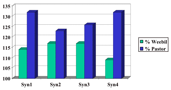 Fig. 2. Yield of some synthetic derivatives under drought stress (200 mm of available water) compared to CIMMYTs benchmark check for drought tolerance Weebill 1, and CIMMYTs globally adapted, dryland check Pastor. Pedigrees of the synthetic lines are