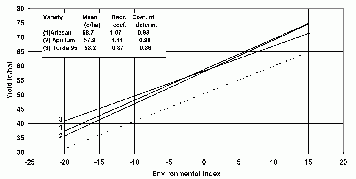 Fig. 2. Regression of the yields of Ariesan, Apullum, and Turda 95 versus the Besostaia 1 (dashed line) check on environmental indicies in 22 ecological trials.