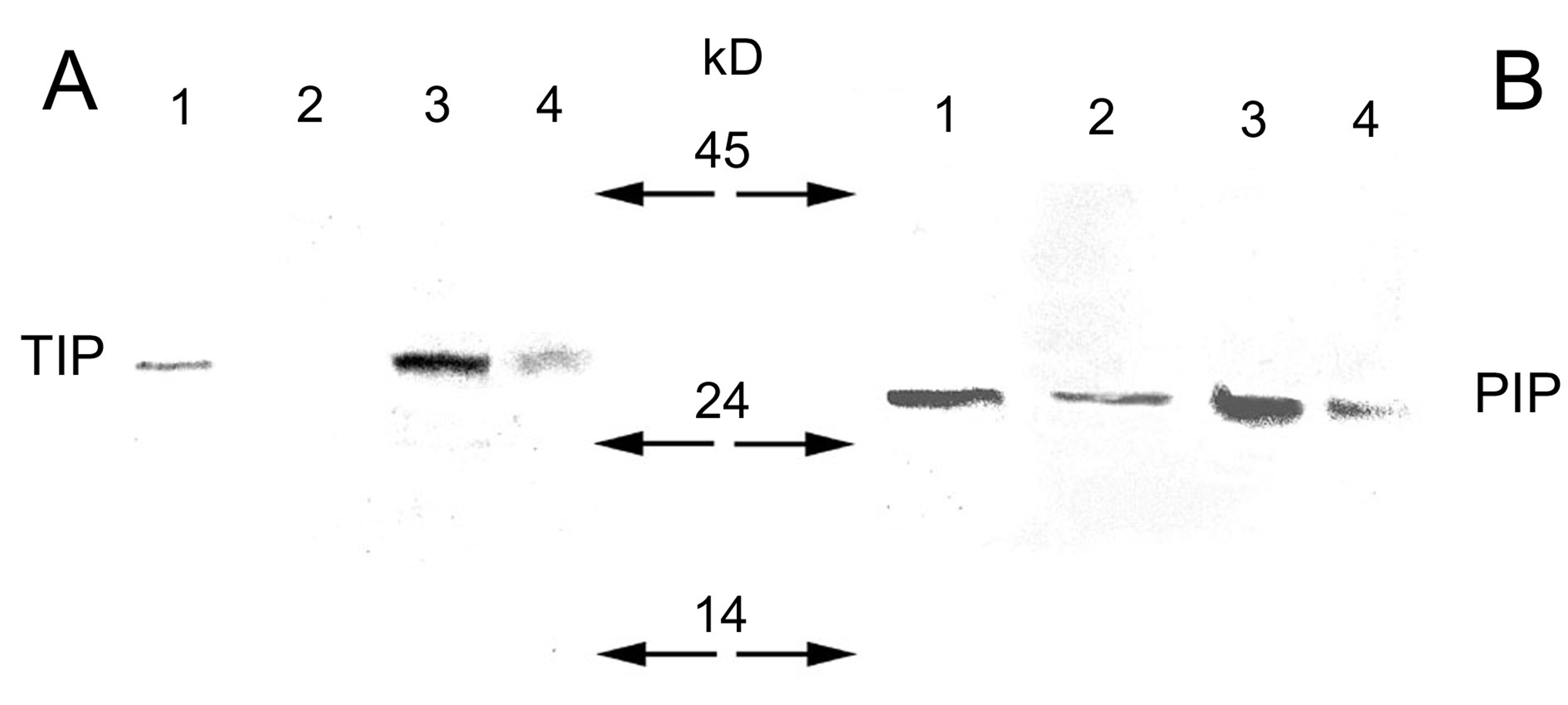 and PIP (plasmalemma-intrinsic protein, B). Immunoblotting of