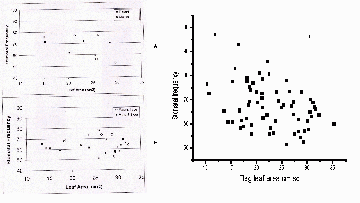 Fig. 1. A, Relationship between leaf area (cm^2^) and stomata/mm^2^ in the parent and the mutant; B, Relationship between leaf area (cm^2^) and stomata/mm2 in the parent and mutant type from F2; and C, Relationship between leaf area (cm^2^) and stomatal frequency in the F2 between parent and mutant.