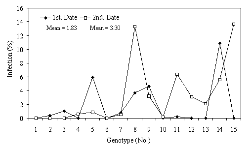 ) of 15 durum wheat genotypes artificially inoculated in the field during the crop cycle 2004-05 on two dates in the Yaqui Valley, Sonora, Mexico.