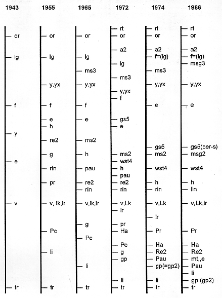 Figure 1. A comparison of gene maps for chromosome 2 of barley published from 1943 to 1986, using the or, v, and tr loci as a common points of reference.