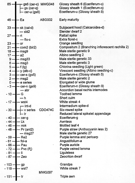 The loci com2 (bir2), Ea, gs1 (cer-cqu), msg9, msg33, and sk (cal-d) are assigned relative positions in the short arm; and the loci cer-g, cer-n (gs9), fol-a, wst7, and Zeo are assigned positions in the long arm of chromosome 2 (Luna Villafaña, 1995). New or revised barley genetic stock (BGS) descriptions for some of the genes in chromosome 2 are being prepared to summarize the information on their phenotypic expression and the linkage data.