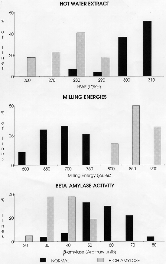 The range of values for the quality components in the two populations are presented in Figure 1. While there is a small amount of overlap for both beta-amylase activity and hot water extract, no high amylose lines with high expressions of either character were obtained. The ranges for milling energy are quite distinct, with all lines of low milling energy having a normal amylose content.