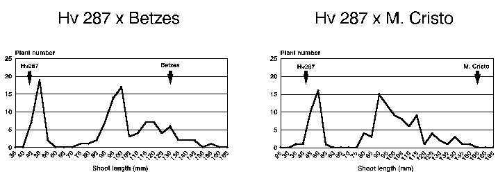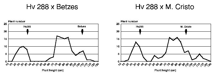 In figure 2 the graphs of the crosses of the GA sensitive mutant 'Hv288' with both 'Betzes' and 'Monte Cristo' are shown. Again monogenic 1 : 3 segregation, this time for final plant height, was evident.