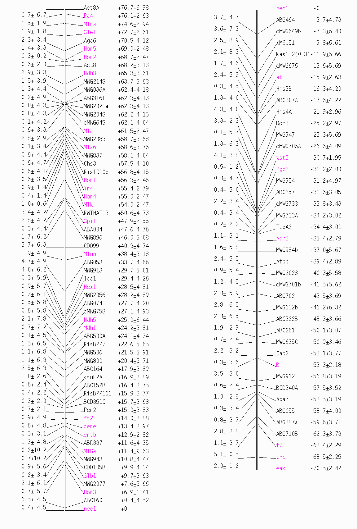 In the former issues of BGN there have been given a linkage map of barley chromosome 5 based on the procedure for estimating linkage maps by Jensen (1987) and based on mainly classical markers and on two-point tests available in published journal. Since most research workers now have access to the Internet I will consider freely available data on the Internet as officially published unless the opposite is explicitly stated. My policy of considering all published linkage data for barley chromosome 5 should therefore also include those available on the Internet. For multi-point tests conducted by the use of molecular markers are usually listed as raw segregation data. To estimate the linkage map is it necessary to have estimates of pair-wise recombination frequencies and their standard deviations, therefore, such calculations has to be done first by me. Further, it is often difficult with the molecular markers to be sure that markers with the same name in different materials are identical (located in the same position). Markers with different names may also be identical. An example of the last situation may occur in the linkage maps shown in Figure 1 where cMWG733 from the cross 'Steptoe'x'Morex' map in position -33.8+/-3.43 cM and MWG733A from the cross 'Harrington'x'TR306' map in -34.2+/-3.02 cM. However, as the mapping populations both are from the north American mapping project the two markers are probably different.