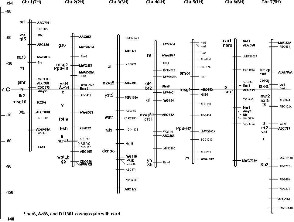 The naked caryopsis locus n was mapped by Heun et al. in Proctor x Nudinka 2.9 cM down from Xcnl.CDO673 and cosegregating with Xcsu.BG143 (Heun et al. nomenclature, these markers are designated CDO673 and BG143 on most barley RFLP maps) (3). The marker CDO673 is mapped in SM very close to the centromere and 3.5 cM up from Amy2. Thus the n locus can be considered to approximate the barley chr. 1 (7H) centromere. The n locus was also mapped 29 cM down from MWG003 (13). This distance is ca. 15 cM in the SM map.